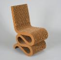 Label TextStrong, environmentally sustainable, and highly sculptural, the Easy Edges series brought architect Frank Gehry overnight success as a furniture designer. Gehry's “Wiggle” chair references the innovative design aesthetic of the 1960s, and, like his architecture, it is characterized by abstract, sculptural qualities. He designed the series between 1969 and 1972 using cardboard as a surprising, lightweight, and cost-efficient material. The Easy Edges pieces owe their robustness and structural stability to the architectural quality of their design. Each of the multiple layers consists of one continuous curving strip of corrugated cardboard running in alternate directions. These are framed with a fiberboard edging (giving the series its name) glued together and held by hidden screws for strength. The pleasing sculptural and sensory qualities of the “Wiggle” side chair are enhanced by the changing surface texture of the cardboard, which becomes soft and suede-like with use.