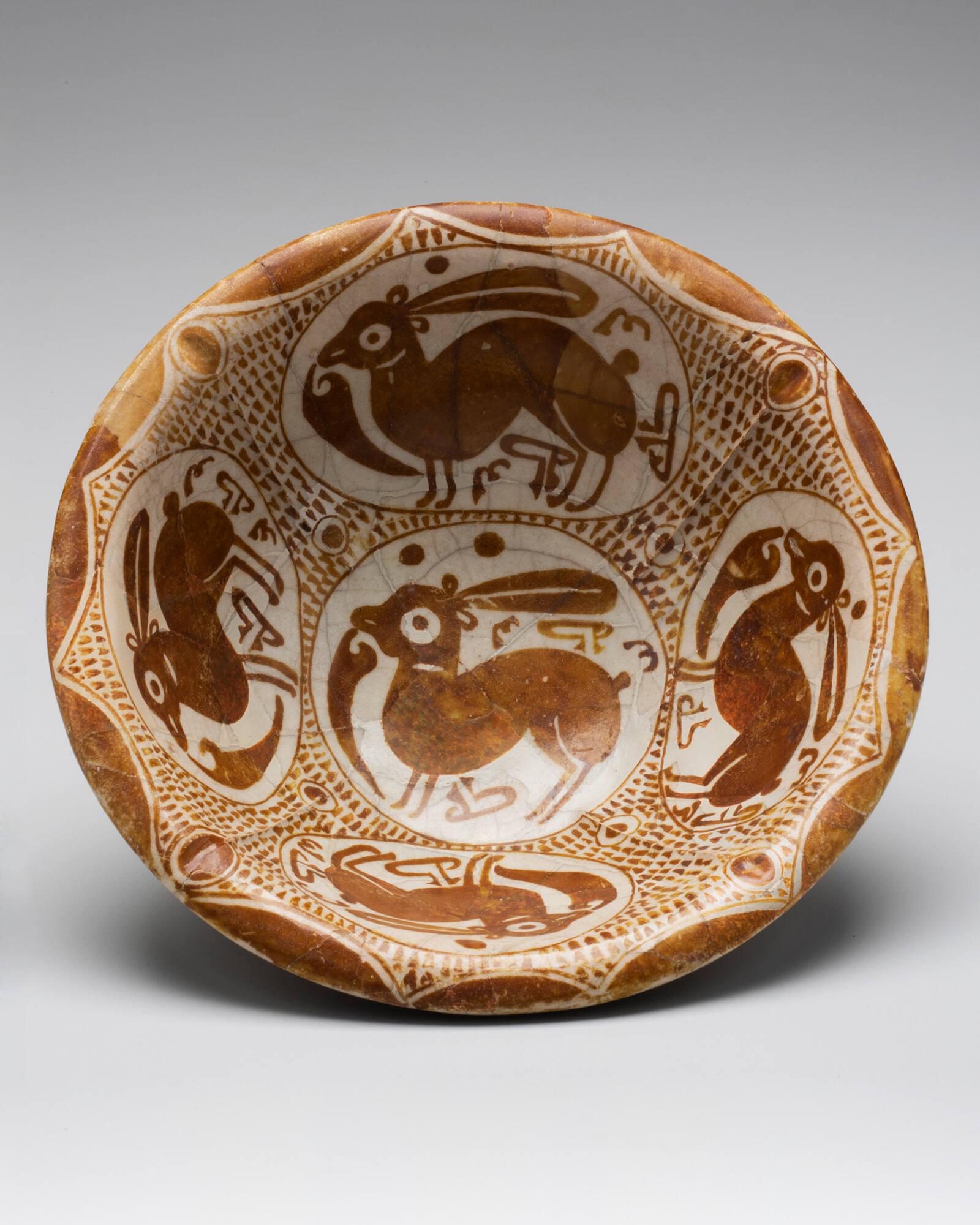Label TextAround the turn of the 9th century, Abbasid potters in Iraq developed a means of imitating Chinese porcelain by coating earthenware with tin-opacified, white glaze to disguise the yellowish hues of local clay. The shape of this bowl also recalls Chinese ceramics. Meanwhile, the metallic sheen of the copper-toned decoration results from an overglaze luster technique that Abbasid potters borrowed from the Islamic glass industry. Taste for lusterware and its production methods later spread from Iraq to Iran, Egypt, and the Iberian PeninsulaPublished ReferencesAn Illustrated Souvenir of the Exhibition of Persian Art, London, London, 1931, p. 53, Ex. #110 A.