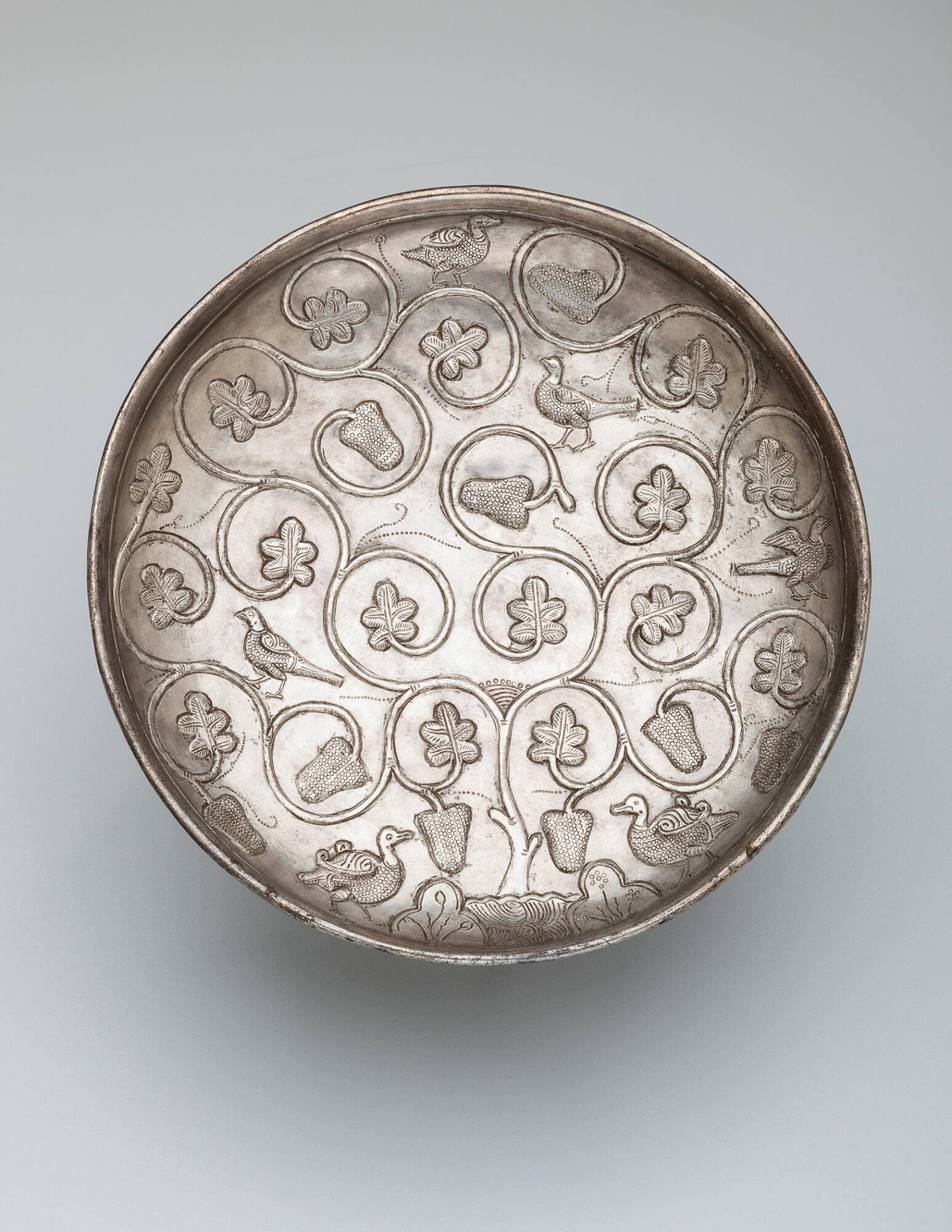 Label TextThis Sasanian silver plate is decorated with a swirling grapevine emerging from a pruned trunk beside stylized mountains and a lake. Six birds nest among the scrolls, including ducks and pheasants. The image reflects themes of fertility, abundance, and elite leisure in late antique Persia. Cast and engraved with remarkable care, the plate likely came from a royal workshop. It was used in ceremonial contexts such as courtly banquets (bazm), where symbolic imagery and luxury materials affirmed elite status. This object, the museum’s earliest Sasanian silver acquisition, complements the more recent 2022.11 plate, offering a view of both symbolic and figural traditions in late Sasanian metalwork from modern-day Iran.Published ReferencesPope, Arthur Upham, and Phyllis Ackermann, "An Unpublished Sassanian Silver Dish," Bulletin of the Iranian Institute, New York, December 1946, pp. 50-57.