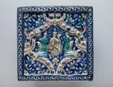 DescriptionA fine-art tile showing a princely figure seated between two attendants amidst floral sprays, flowers and decorative bands. Navy blue ground with details in yellow, turquoise and purple.