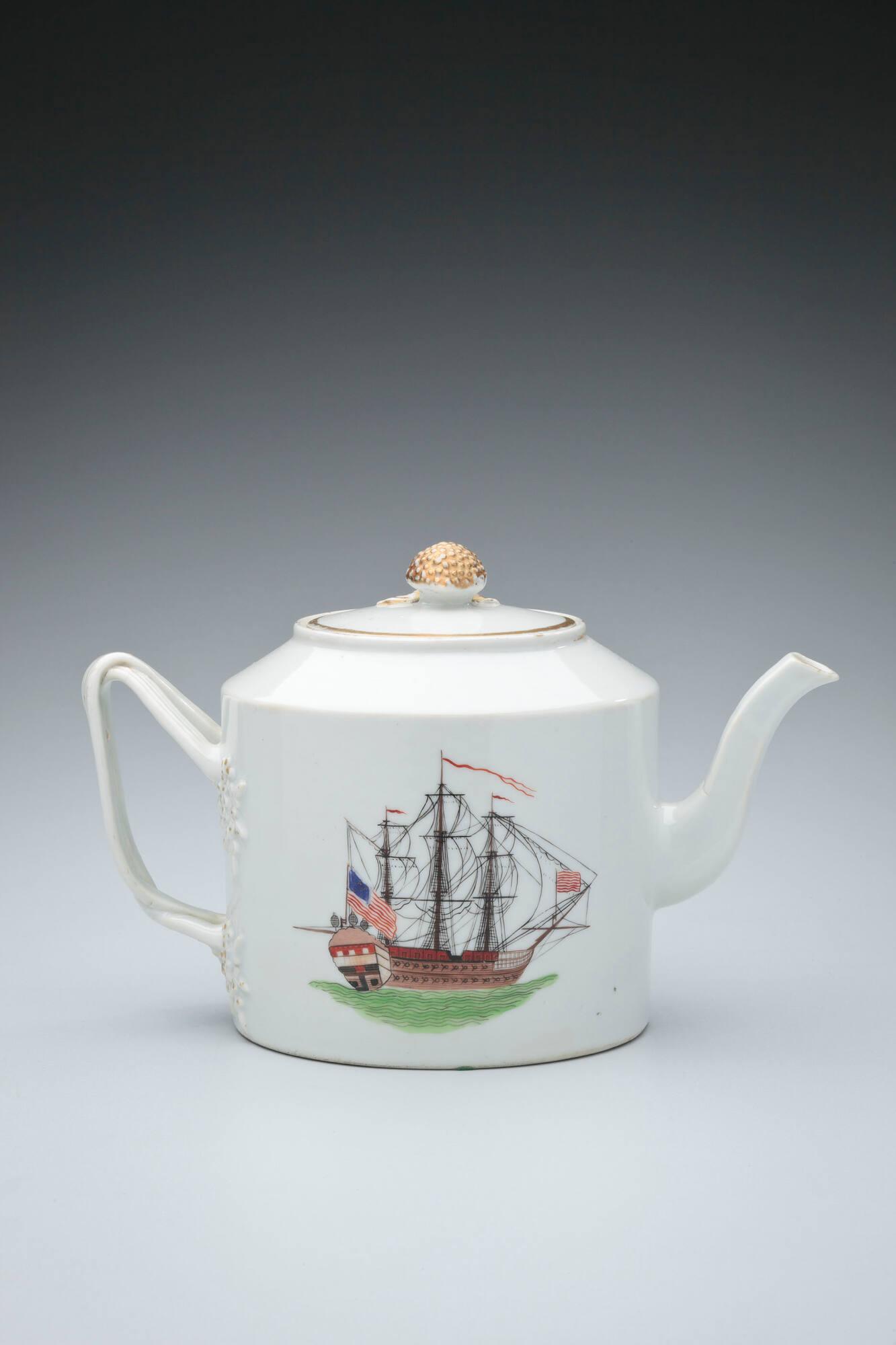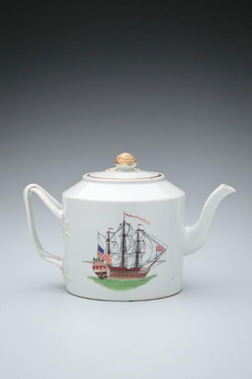 DescriptionDrum shape porcelain teapot with ribbon handle and lid with berry finial. Decorated in polychrome, front and reverse with a ship flying the American flag.