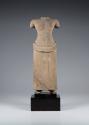 DescriptionSandstone statue of a standing female figure, head and both arms missing. The figure wears a long, close-fitting skirt with a narrow, folded-over waistband extending across the hips and a distinct front panel decorated with incised vertical lines and bordered with beaded and foliate motifs. A broad belt features vertically oriented motifs and small pendants. The breasts are modest; shoulders are square with minimal anatomical detail. The navel sits in a shallow depression. The back is plain, with a faint spinal groove.