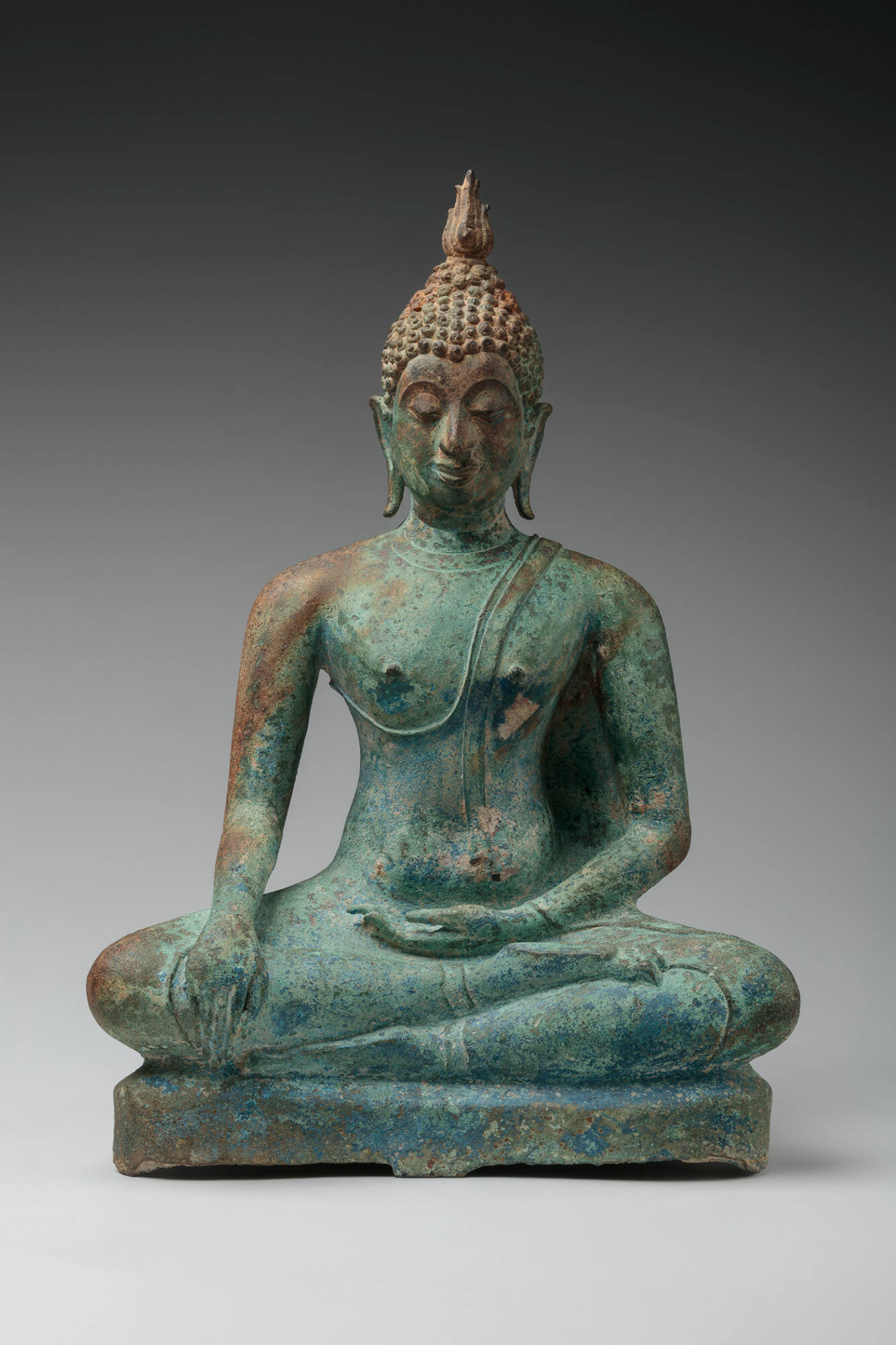 Label TextThis Buddha displays the “earth touching gesture” or Bhumisparsa mudra, which symbolizes the historical Buddha—Siddhartha Gautama, or Shakyamuni—attaining full enlightenment (nirvana). The story is one of the most popular and inspiring subjects of Buddhist art. After sitting in meditation under the sacred Bodhi tree, Prince Siddhartha was tempted by the demon king Mara. The Buddha-to-be resisted and touched his right hand to Mother Earth, calling her to witness his rebuff of the demon and asking for the strength to achieve enlightenment. She granted his wish by banishing Mara, thus allowing “Buddha” (meaning “Enlightened One”) to enter his full manifestation.Published ReferencesGroslier, B., The Art of Indochina, Including Thailand, Vietnam, Laos and Cambodia (from Art of the World Series), New York, 1962, pp. 202-226.