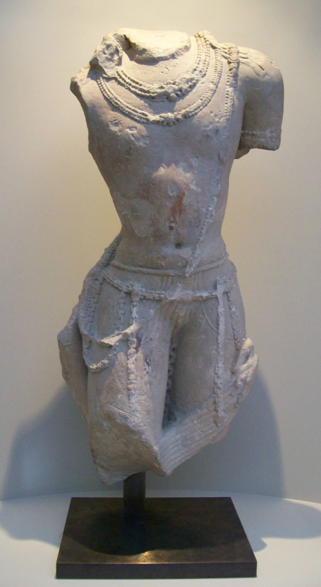 DescriptionThis is a fragmentary, life-size sandstone sculpture of a male torso. The head, arms, and lower legs are missing. The figure stands in a pronounced triple-bend (tribhanga) pose, with the hip thrust outward. It is adorned with layered necklaces, an armband on the remaining upper portion of the left arm, and a sacred thread (yajnopavita) draped from the left shoulder. A detailed belt secures a diaphanous lower garment (dhoti), which clings to the body and reveals the contours of the legs.