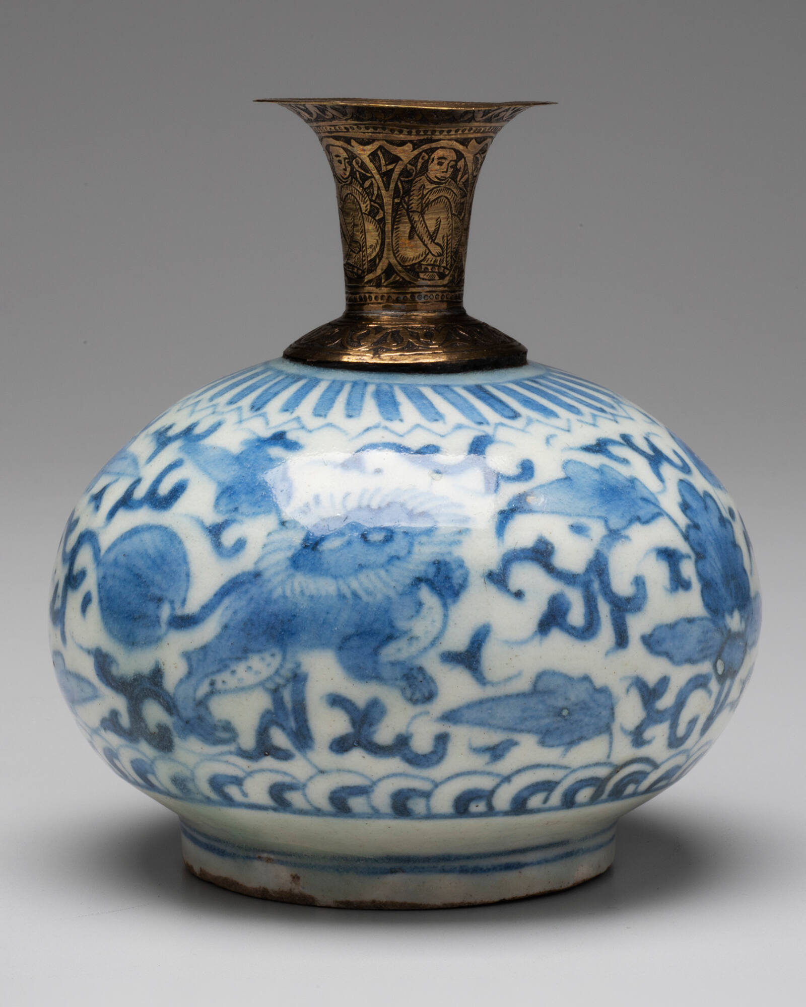 DescriptionA blue-and-white bottle, decorated with lions, flowers and stylized cloud motifs; dashes and zig-zag pattern on neck.