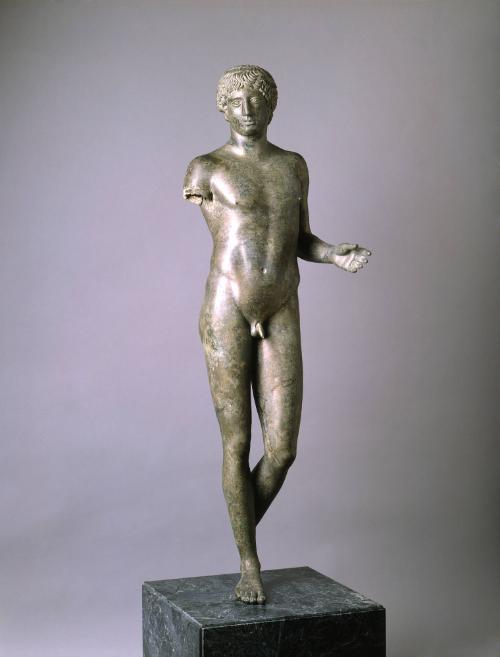 DescriptionLife-sized bronze statue of a slender youth. The figure stands on the right foot with the left trailing behind, creating a prominent hip thrust. The left arm is extended with an open palm, and the right arm is missing below the shoulder. The head tilts slightly right, with short, neatly curled hair. Incised almond-shaped eyes with marked pupils and irises. Surface striations and flow welds evident in the metalwork.