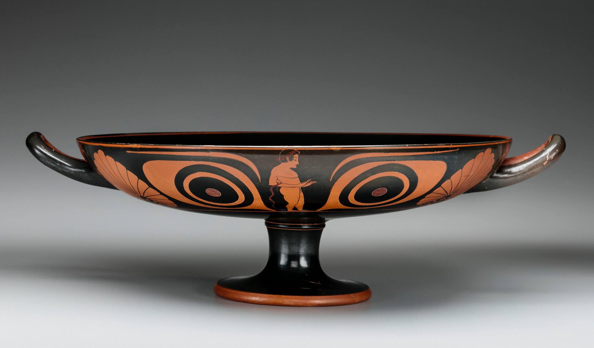 Label TextThis cup marks a pivotal moment in Greek art when vase painters shifted from black-figure to red-figure decoration, transforming how stories were told in clay. Around 520 BCE, Athenian workshops began experimenting with these two techniques side by side. Inside the cup, the centaur is painted in the older black-figure style, where details are scratched into a glossy surface. On the outside, the scenes of an athlete and a youth marking the earth use the newer red-figure technique, allowing for more natural poses and subtler details. This blend of styles, known as “bilingual,” reflects both technical innovation and a marketplace in transition. The Bowdoin Eye Painter, who made this cup, was among the first artists to explore this balance of old and new. The large painted eyes on the cup held different meanings depending on the context. In Athens, such eye-cups were likely used at symposia, social gatherings where drinking and conversation took place. There, the eyes may have had a playful function, making the drinker’s face resemble a mask when the cup was raised. However, most of these cups have been found in Etruscan tombs in central Italy. For the Etruscans, they were probably valued as grave offerings. The eyes may have been understood as protective symbols or reminders of banquet scenes associated with the afterlife, showing how Greek objects were reinterpreted in other cultures.Published ReferencesBeazley, John D., Attic Red-figure Vase-painters, Oxford, 2nd ed., 1963, p. 1630, no. 3 bis. and p. 1621, no. 109 bis.