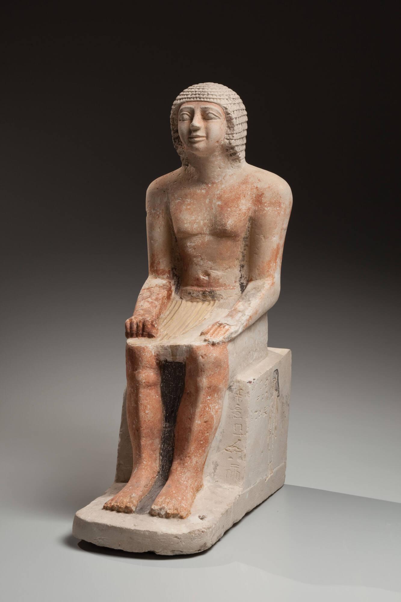 DescriptionThis white limestone statue depicts Raramu seated on a rectangular block. The seat slopes downward at the front, with a rounded base. His hands rest on his knees—his right hand closed, left open palm-down. He wears a short wig, kilt, and pleated apron with a belt. Colors are well-preserved: black (hair, eyebrows, eyelashes, belt buckle, spaces between arms, legs), red (body), white (kilt), yellow (apron), and gray (seat). His name and titles are inscribed vertically on the front and base of the seat.