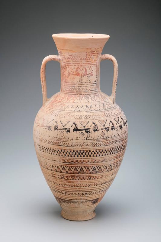 DescriptionThis amphora is tall with a narrow foot, broad shoulder, and short neck, as restored. The surface is densely covered with geometric motifs including chevrons, zigzags, X-shapes, and dotted bands. On the neck, two horses stand in heraldic opposition flanking a central post, while the body displays a frieze of left-facing horses. Below the neck are stylized long-necked birds.