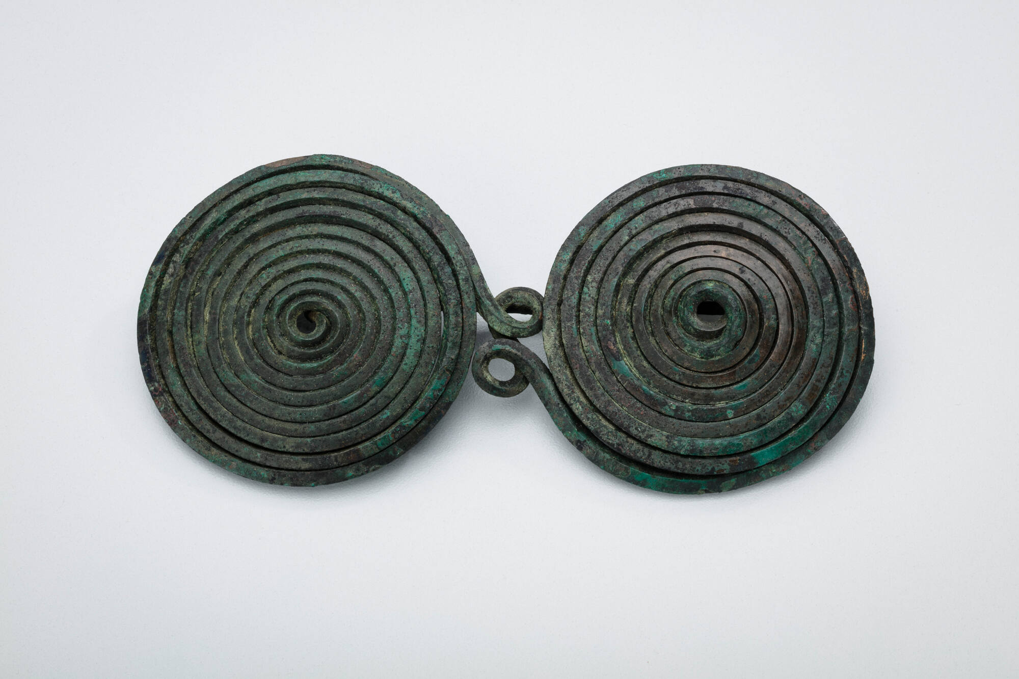 DescriptionThis large fastener is skillfully crafted from a single, continuous length of bronze wire that is rhomboidal in cross-section. The wire has been forged and hammered into two large, flat, counter-wound spirals. These spirals are joined at the center by a figure-eight loop, creating a symmetrical, spectacle-like appearance. The two ends of the original wire are fashioned on the reverse to form a functional pin and catch-plate.