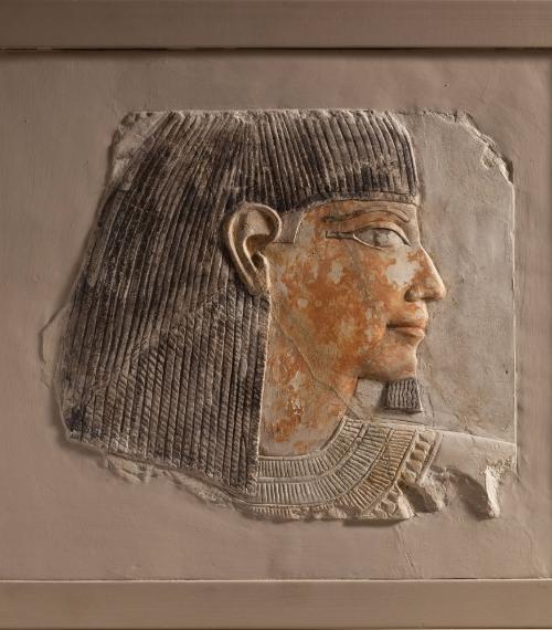 DescriptionThis is a finely carved and painted relief depicting a man’s head in profile, facing right. The figure is over life-size and rendered in low relief, with subtle contours and crisp outlines. The subject wears a double-layered, shoulder-length wig and a short beard. The hair is painted black, and the face is a reddish-brown tone. There are traces of ancient repairs in the wig, visible through plaster beneath original pigment.