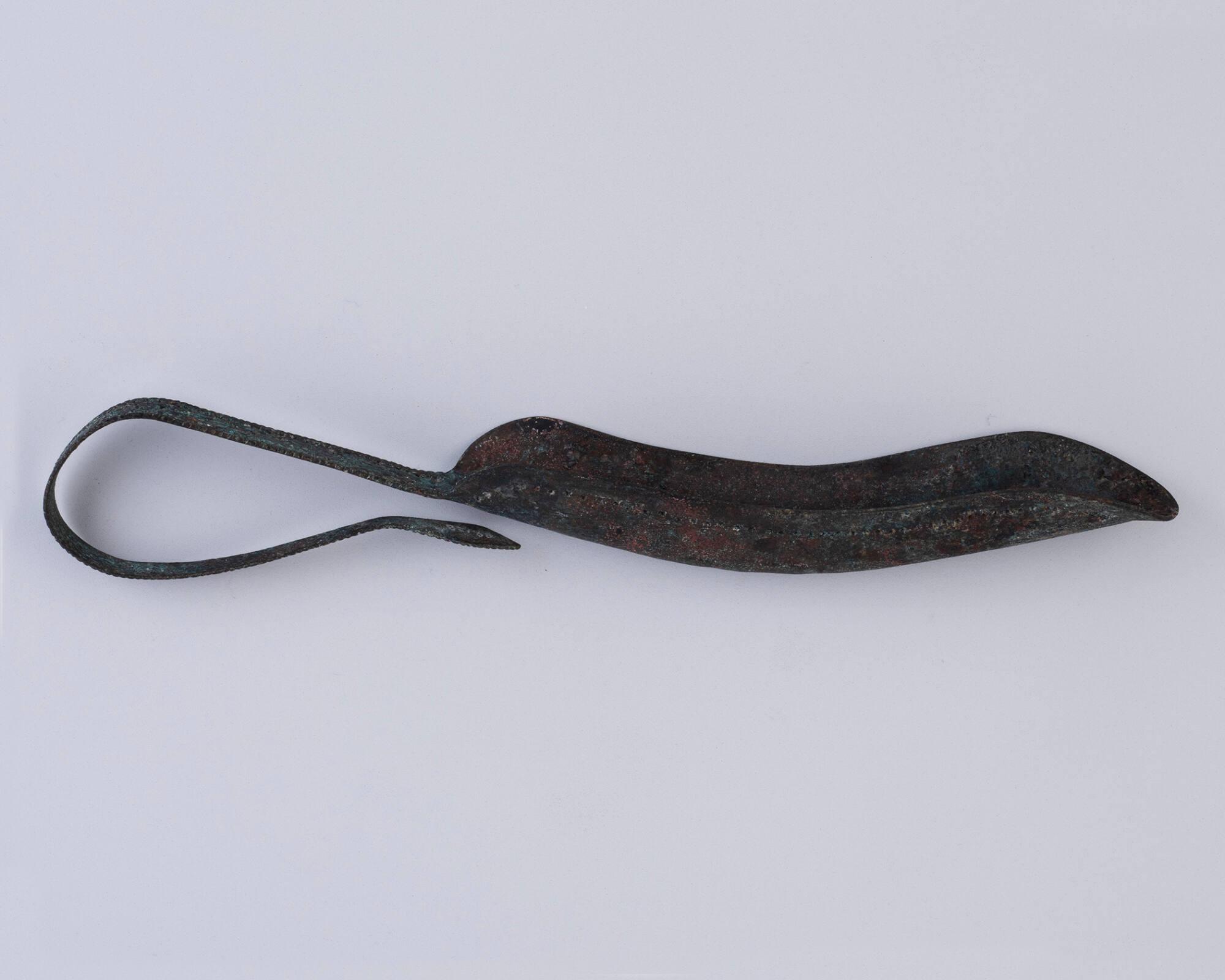 Label TextBefore the invention of soap, ancient Greek athletes and bathers used curved tools like this strigil to clean their bodies. After exercising in the gymnasium, an athlete would cover his skin with olive oil to loosen dust, sweat, and grime. He would then scrape off the mixture using the strigil’s concave bronze blade. This daily ritual was so central to Greek life that strigils became common symbols of athleticism and are frequently found in tombs, signifying the deceased's participation in gymnasia culture. This example, likely made in the Greek colonies of southern Italy, features delicate beaded decoration along the handle.