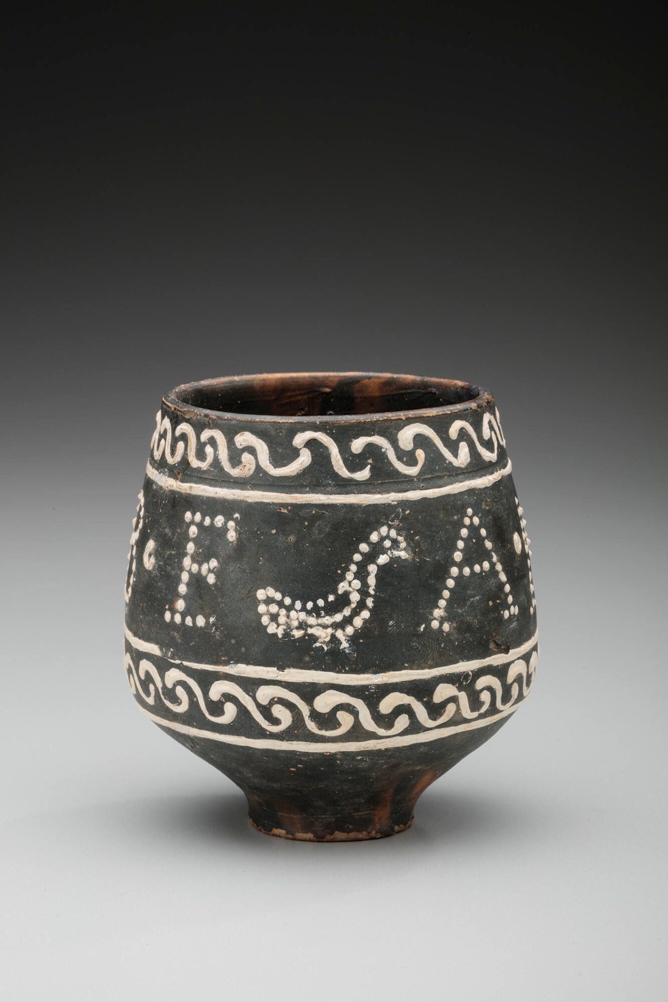 DescriptionThis cup consists of a pale clay body covered in a dark grey slip. Its primary decoration, applied in thick, raised white slip, is a wide band featuring the Latin words "A ME" and "BIBE". A stylized bird appears before the inscription and a floral motif after it. This band is framed by encircling lines and a broken wave pattern. The vessel is intact but has a fine, vertical hairline crack running from the rim to the widest part of the body, passing through the letter 'M'. A small chip is visible on the interior of the rim corresponding to the crack. A fingerprint, likely from the original potter, is preserved in the clay next to the bird motif.