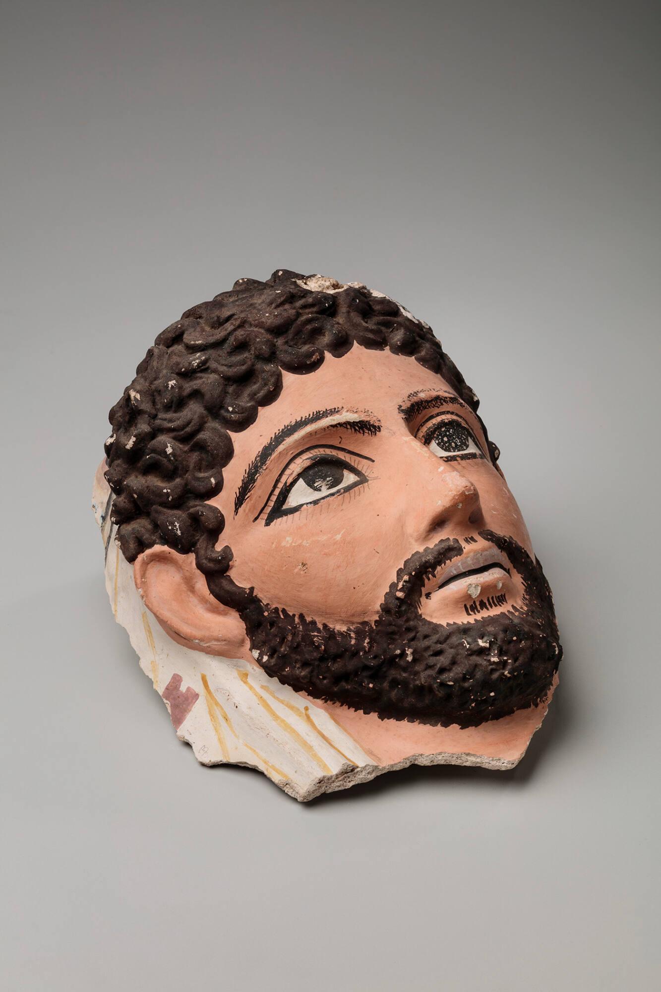 Label TextThis mummy mask represents a young man from Roman-era Egypt. It was not a portrait of a specific person, but an idealized face for the deceased, designed to magically grant them a perfect, divine appearance for the afterlife. The style, especially the curly hair and beard, was fashionable during the reign of the Roman Emperor Hadrian, allowing us to date it quite precisely. Made of painted and gilded plaster, the mask would have been placed over the head of a mummy, serving as a powerful ritual object in funerary ceremonies. This mask is a great example of cultural syncretism, the blending of different cultural traditions. It perfectly marries Roman style with Egyptian belief. The person commemorated was likely an elite member of Egyptian society who embraced the fashions of the Roman Empire but held onto the ancient Egyptian beliefs about the afterlife. The object is a tangible piece of this multicultural world, showing how people navigated complex identities.Published References