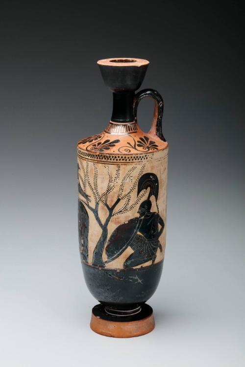 Label TextThis Athenian lekythos shows the Trojan princess Polyxena at a fountain, gently dipping her hand into the stream as she fills her water jug. Unbeknownst to her, Achilles hides behind a tree, shield ready, watching. Though nothing violent occurs, the scene is filled with tension. In myth, Polyxena is later sacrificed at Achilles’ tombPublished ReferencesBrommer, F., Vasenlisten zur griechischen Heldensage, 2nd ed., 1960, p. 265, no. 29.