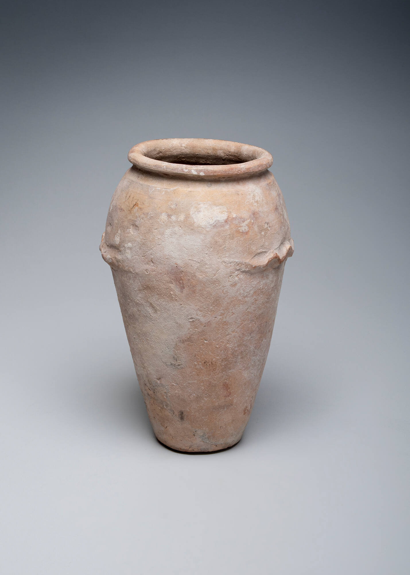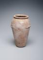 DescriptionThis vessel is a wheel-finished tall ovoid jar with a flattened base and a rolled rim. The body is constructed from a dense, pale-buff marl clay. Two integral ledge handles with scalloped "wavy" profiles are applied to the shoulder of the vessel, approximately one-third of the way down the body.