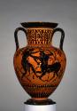 Label TextThis Attic black-figure amphora, attributed to the Acheloos Painter, was discovered in 1886 in a tomb at Suessula, an ancient site in southern Italy excavated by Marcello Spinelli, baron of Barra and prince of Scalea. The tomb, among the largest in the necropolis, contained two burials and a collection of fine ceramics, suggesting it belonged to an elite family. One scene on the vase shows Herakles wrestling the river god Acheloos, who appears in a hybrid centaur-like form. In myth, Acheloos was a shapeshifter who could take the form of a bull, a serpent, or a man-headed creature. Here, he rears up on his hind legs, wielding a stone as Herakles seizes him by the horn. The opposite scene depicts a woman riding a bull, long debated as either a maenad or Europa, the Phoenician princess famously abducted by Zeus, who took the form of a bull and carried her across the sea to Crete.Published ReferencesDuhn, Friedrich Karl von, “La necropoli di Suessula,” Mitteilungen des Deutschen Archäologischen Instituts, Römische Abteilung, vol. 2, 1887, p. 258, no. 1, fig. 23, pls. 11-12.
