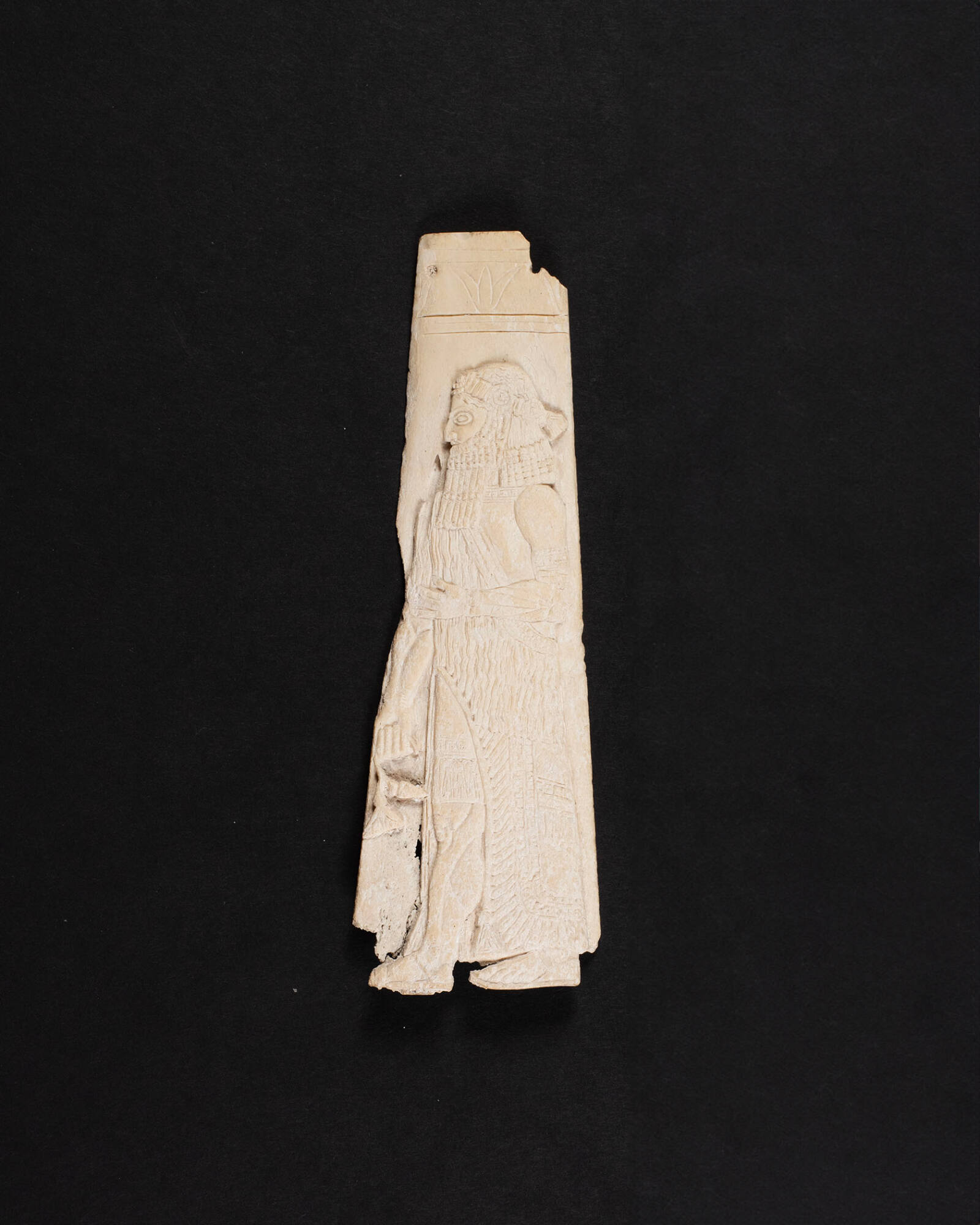 DescriptionThis small rectangular relief, about 7 inches in height, is carved from bone and depicts a bearded male figure standing in profile, holding a lotus blossom in one hand. The figure is rendered in low relief with no background, suggesting the panel was part of a larger composition, likely mounted on a piece of furniture such as a high-backed ceremonial chair. Its stylistic affinities mimic North Syrian ivories sent as tribute to the Neo-Assyrian court.