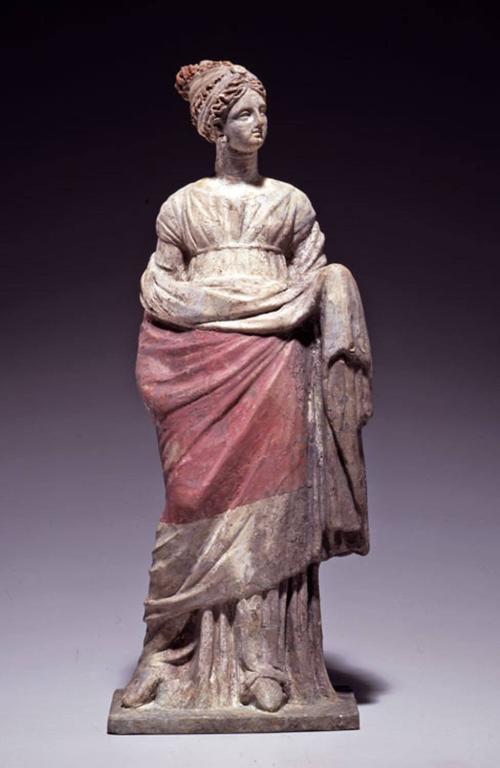 Label TextThe ancient Greeks made figures in wood, metal, and ceramic as offerings for tombs, temples, and household altars. Elegantly dressed in the height of fashion, this woman may represent a goddess but is more likely a worshipper. Quantities of these types of statues were found in tombs and temple sites in a small town called Tanagra in central Greece. They were created by using two molds, one for the front of the statue and one for the back, with many of the details formed separately and added before firing in a kiln. They were then painted to look as natural as possible.Exhibition HistoryToledo Museum of Art, A Decade of Giving: The Apollo Society at the Toledo Museum of Art, 1996, p. 20, repr. (col.).