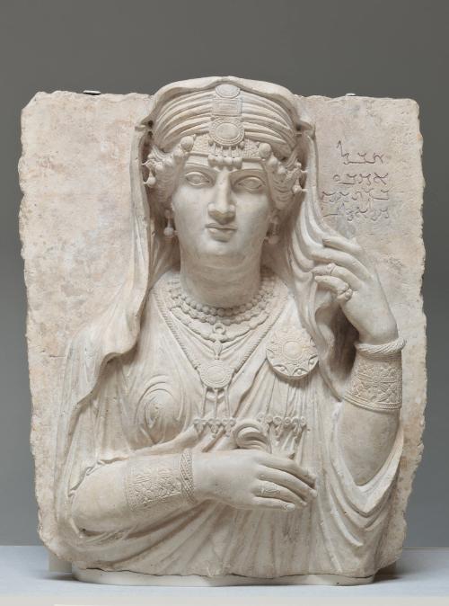 DescriptionA high-relief, rectangular limestone bust of a woman facing forward. She wears a tunic and a himation (cloak) which is fastened on her left shoulder with a circular brooch and draped over her head as a veil. Her right hand is raised to hold the edge of the veil near her cheek, while her left arm crosses her body to hold a fold of the garment. She wears an ornate, high turban with a central floral motif and a diadem band. Her jewelry is extensive, including a chain with cabochon gems looped over her forehead, temple pendants, dumbbell-shaped earrings, four distinct necklaces (including a choker and a long chain with a crescent pendant), broad cuff-style armlets with panel decoration, and twisted spiral bracelets. An Aramaic inscription is carved into the upper left corner. Traces of red, blue, green, yellow, and black pigment are visible on the jewelry, eyes, and inscription.