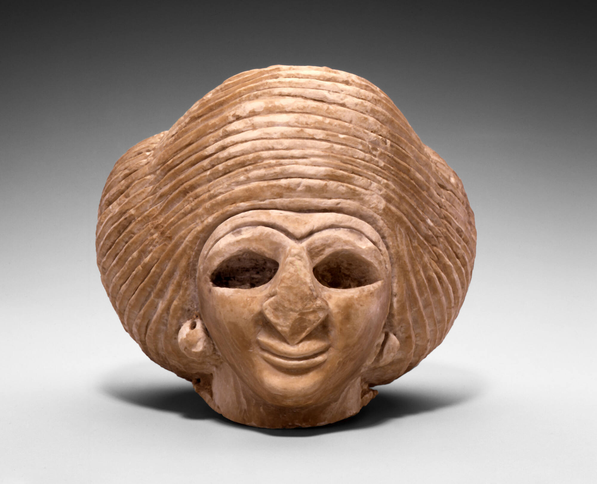 Label TextThis carved head once belonged to a full-standing votive statue, dedicated in a Mesopotamian temple to represent a worshipper in eternal prayer. During the Early Dynastic period, temples housed numerous such figures, their clasped hands and wide, inlaid eyes symbolizing perpetual devotion before the gods. Archaeological excavations at sites like Tell Asmar and Khafajah have uncovered caches of these statuettes, often buried beneath temple floors during renovations, a sign of their sacred status.Published ReferencesToledo Museum of Art, Toledo Treasures, Toledo, 1995, p. 34, repr. (col.).