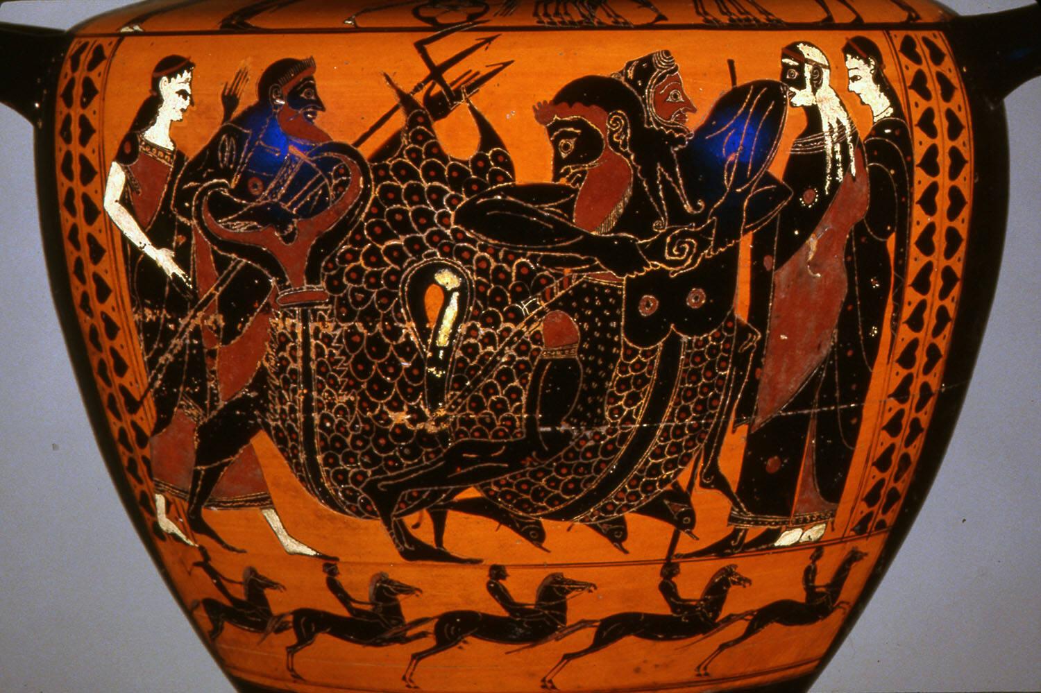 DescriptionThis black-figure hydria features Herakles wrestling Triton on the main panel, Athena mounting a chariot above, and a horse race below.