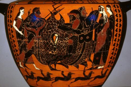 Hydria with Herakles and Triton