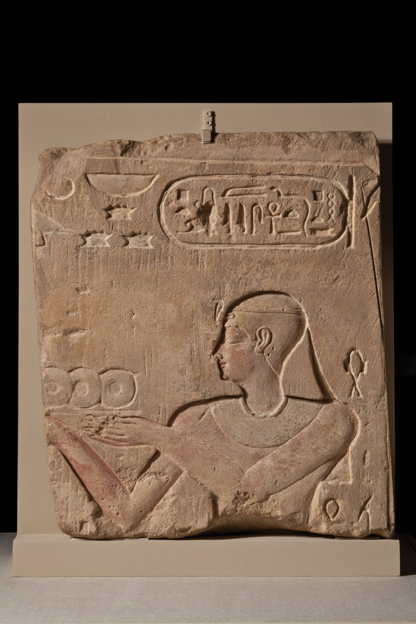 Label TextOnce part of a temple wall, this relief carving presents a typically Egyptian combination of image and text, royalty and piety. The Pharaoh offers heavy gold rings to a god, whose image would have been at the left. He is rendered in an Egyptian style invented around 3000 BCE: the eye and shoulders of the king are depicted from the front, the arms and head in profile. Inscribed above him is a large horizontal loop of rope—a cartouche—that surrounds, designates, and protects one of the king’s names. To the right of the king’s head is a hieroglyph meaning “protection.”Published ReferencesMunzen und Medaillen, Apr. 28, 1972, lot 128, repr. (sales cat.).