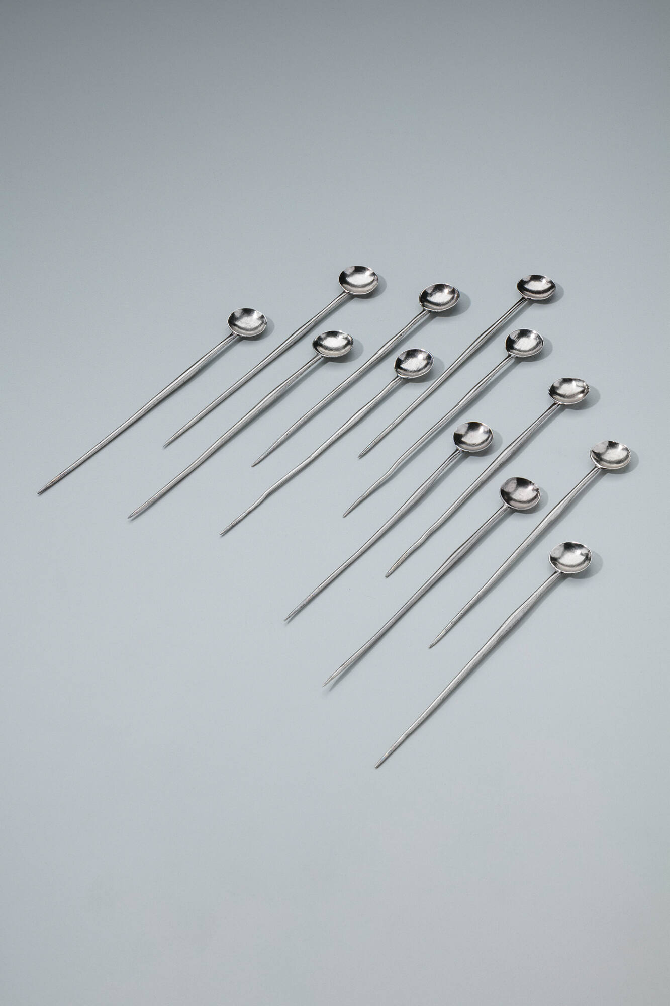 DescriptionA matching set of twelve silver spoons with slender handles and small, elliptical bowls, identified as cocleria.