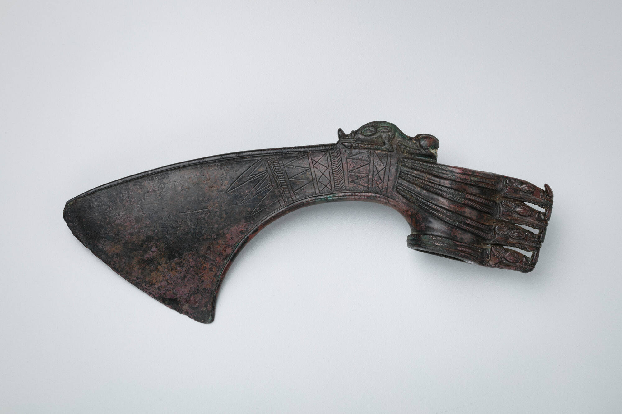 DescriptionA cast bronze ax head with a flat blade and a curvilinear profile. A cylindrical socket features four boars' heads stacked vertically down its outer edge. A fifth, crouching boar sits on the top edge of the blade at its junction with the socket, facing the outer edge. A bronze rope design, described as "strands," begins at the necks of the boars' heads and extends across the socket area. The blade has an offset, profiled edge and is decorated with incised geometric patterns, including hatching in two directions, parallel lines, and zig-zag lines. The boars' facial features (mouths, eye sockets, ears) and the rope strands are also detailed with incised hatching.
