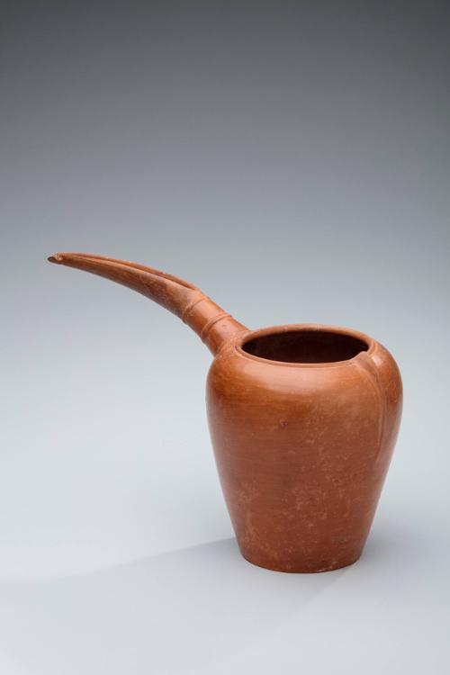 DescriptionThis reddish-brown earthenware vessel features a rounded shoulder and a tall, gradually narrowing body. A hollow handle-spout curves upward from the shoulder and includes a slit for pouring. Opposite it is an unpierced vertical lug. The vessel’s surface is smoothly burnished, and a scored grid pattern appears on the flat base.