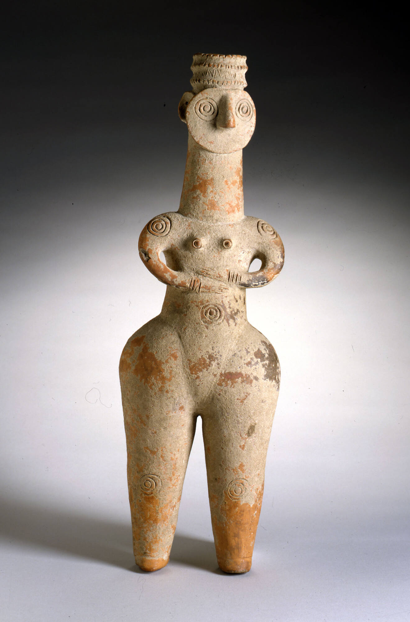Label TextThis striking terracotta figure belongs to a group of sophisticated ceramic sculptures found in Iron Age tombs in Northwestern Iran, a region often named after the village of Amlash. Although the Amlash culture left no written records, its burial contexts suggest a ritual or cultic purpose. With its exaggerated hips and buttocks, the figure is widely interpreted as a fertility goddess. These figures were likely offerings or dedications used in ritual to ensure a bountiful harvest and the multiplication of livestock. The design is highly abstract, featuring a mask-like face with piercing eyes indicated by concentric circles, arms curved like animal horns, and a distinctive triple-fillet headdress. Its artistic simplicity and bold geometric abstraction resonated strongly with 20th-century artists, including Pablo Picasso.Published References"Museum and departmental announcements," Newsletter, Midwest Art History Society, no. 15A, Spring, 1988, p. 9.
