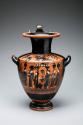 Label TextThe main scene of this hydria shows six women gathering at a fountain house, which was one of Greek women’s limited social activities. They collect water for their homes in vessels like the one the scene is painted on, holding and carrying them in a variety of positions. The artist shows the women talking, gesturing, and making eye contact, with their bodies overlapping each other and the fountain architecture. On the shoulder, a charioteer, an archer, and a foot soldier depart for war; an old man seated on a block bids them farewell.Published ReferencesKunstwerke der Antike: Auktion XXII, Münzen und Medaillen AG Basel, 13 May 1961, pp. 72-73, lot no. 139.