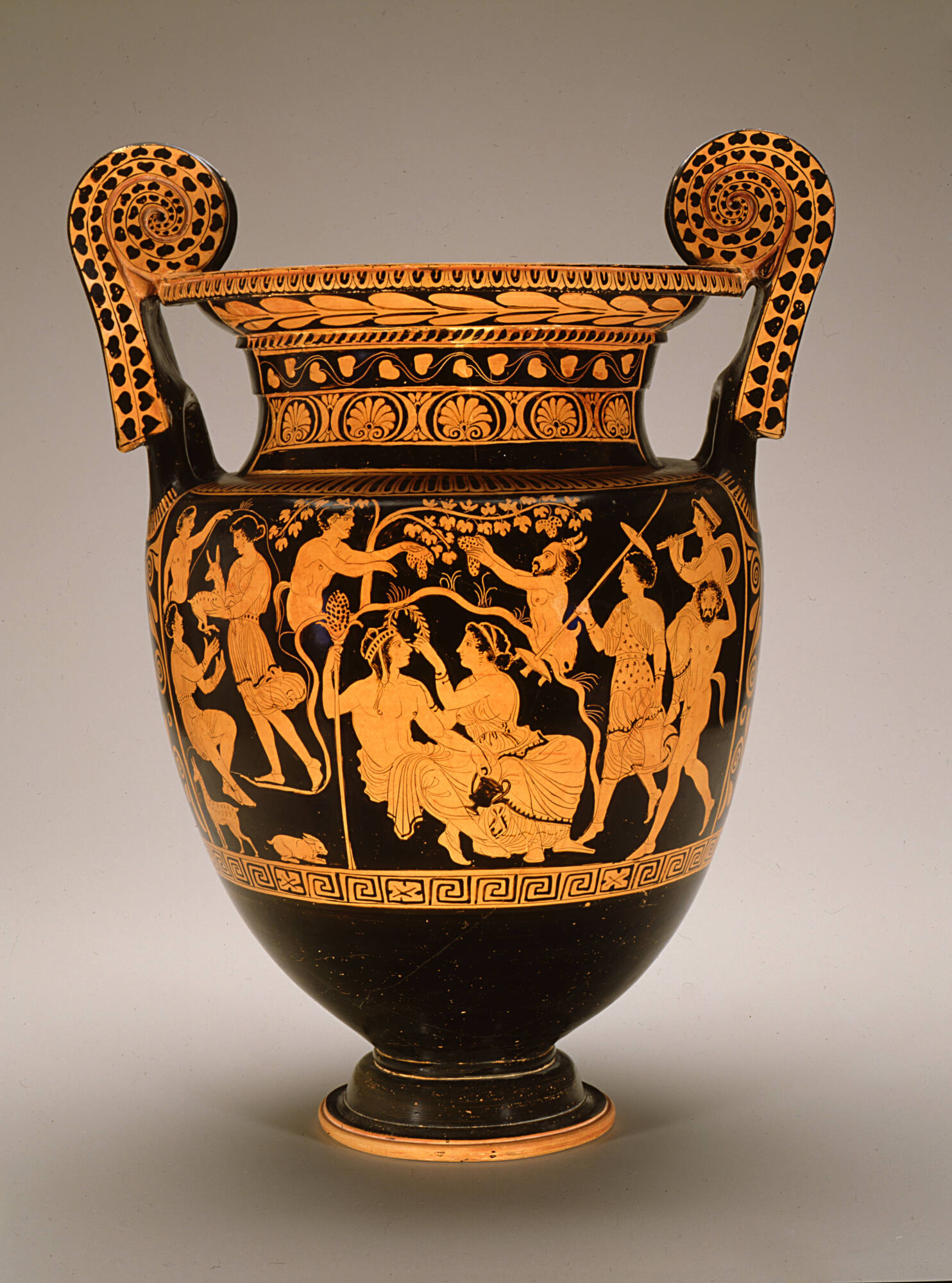 Label TextOn this large vessel used to mix wine and water, a young warrior takes leave of his wife and returns from battle victorious. On the opposite side, in a cave, Ariadne crowns her husband Dionysos, god of wine, rebirth, and the theater, with a laurel wreath. Around them, Pan, the god of the forest, satyrs (part-men, part-goats), and maenads (female followers of Dionysos) prepare for a celebration.Published ReferencesLuckner, Kurt T., in The Art of South Italy: Vases from Magna Graecia, Richmond, 1982, no. 6, pp. 63-66.