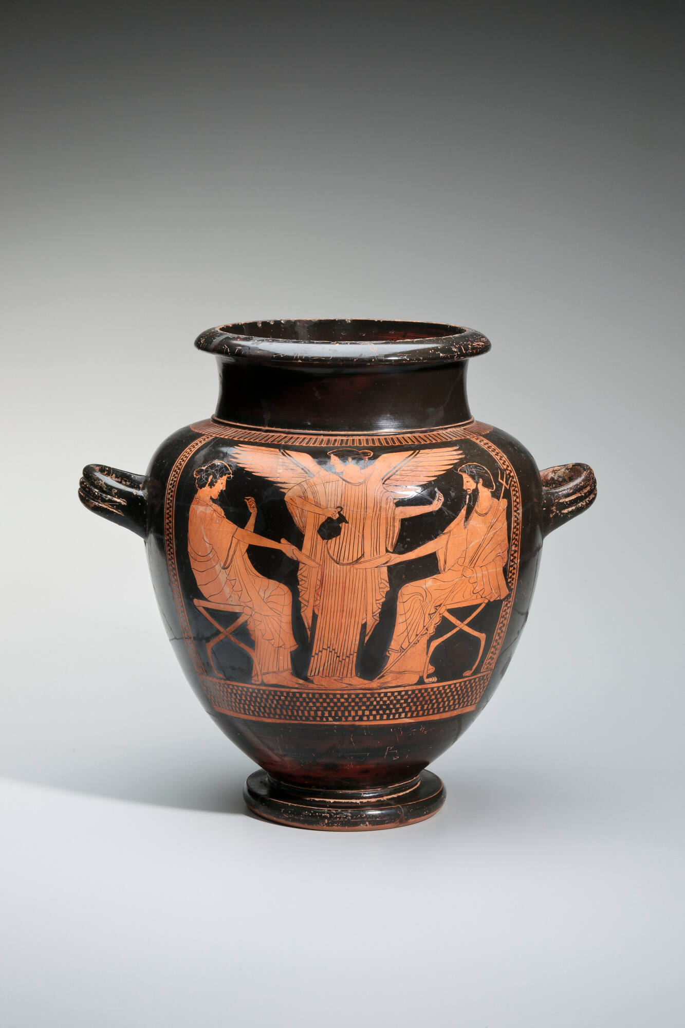 DescriptionRed-figure stamnos with added red and reserved outlines. On the front (Side A), Poseidon and Amphitrite sit facing each other on folding stools, each holding a phiale for wine libation. Between them stands a winged Nike who holds an oinochoe and a flower. All wear chiton and himation. Nike’s wings and drapery are rendered in strict symmetry, with upper edges aligned to the painted border above. The scene is framed by tongue, net, and checker borders. On the reverse (Side B), a trainer in back view addresses two nude boxers preparing for a contest. He holds a wand and a pair of styluses. The boxers adjust thongs in their hands. Thongs are rendered in relief lines. Selective use of added red appears in fillets, floral elements, wine stream, and one athlete’s wreath. Graffito traces visible under foot.