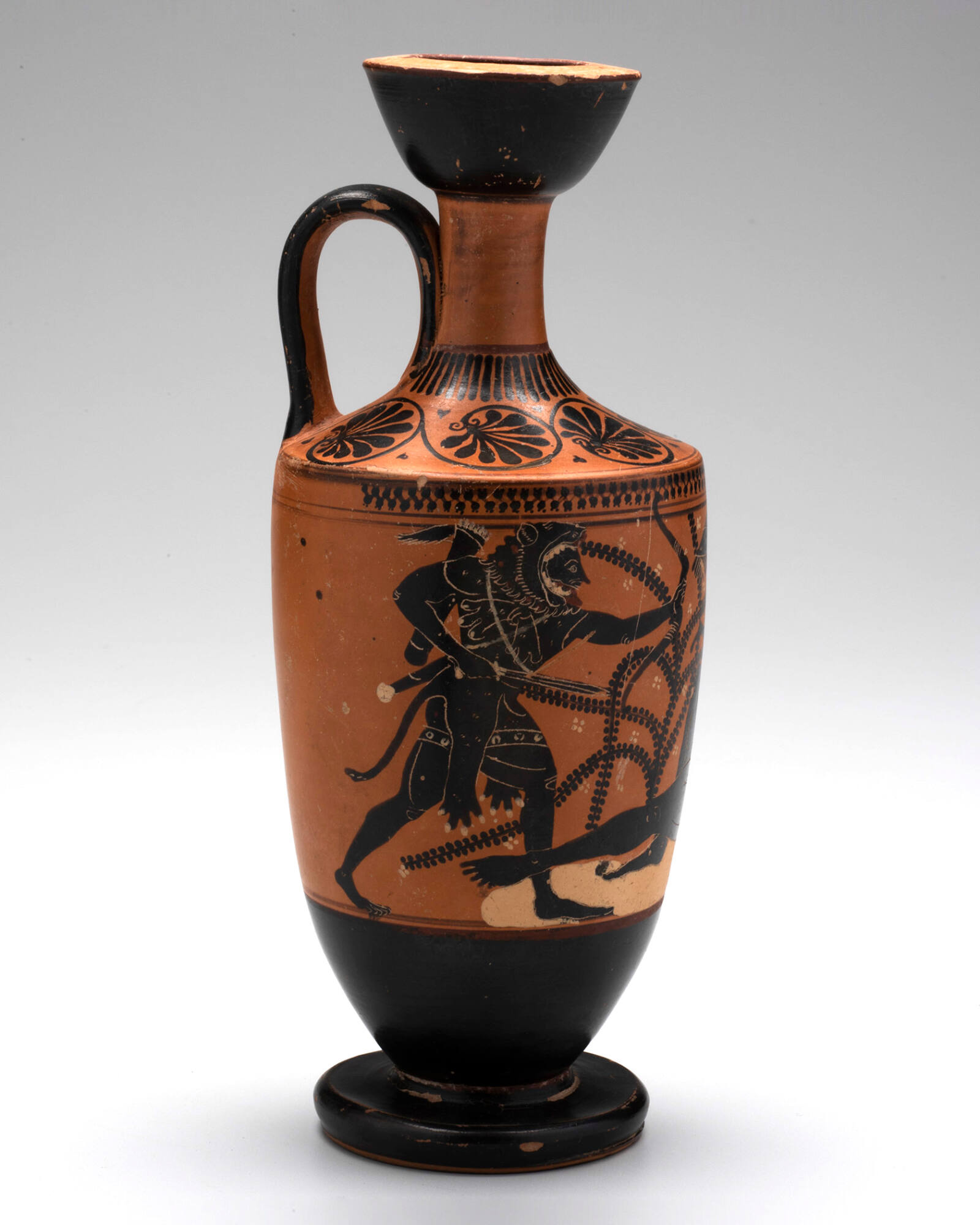 DescriptionA wheel-thrown ceramic oil flask (lekythos) with a narrow neck, deep mouth, and single vertical handle. The body tapers to a disc foot. The surface is decorated in the black-figure technique with incised details and added red and white pigments. The shoulder features a frieze of five palmettes alternating with ivy leaves. The main body scene depicts a bearded Herakles, wearing a lion skin over a short chiton, advancing from the left with a sword and bow. He attacks the bearded giant Alkyoneus, who reclines awkwardly on a rock, his body twisting between frontal and profile views. A small, winged youth (Hypnos) hovers horizontally above the giant. Leafy branches with white blossoms fill the background.