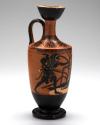 Label TextThis oil jar captures a tense moment from the Gigantomachy, the cosmic battle between gods and giants. The hero Herakles creeps forward with sword drawn to ambush the giant Alkyoneus, who is immortal only within his homeland. The giant lies in a fitful, restless sleep—notice how his body twists awkwardly, tipping forward as if about to wake or fall, while his fingers curl into the rock for support. Hovering above him is the tiny, winged figure of Hypnos (Sleep), casting the spell that renders the giant vulnerable. This vessel was likely used in funeral rites and was reportedly found in a tomb in Gela, Sicily.Published References