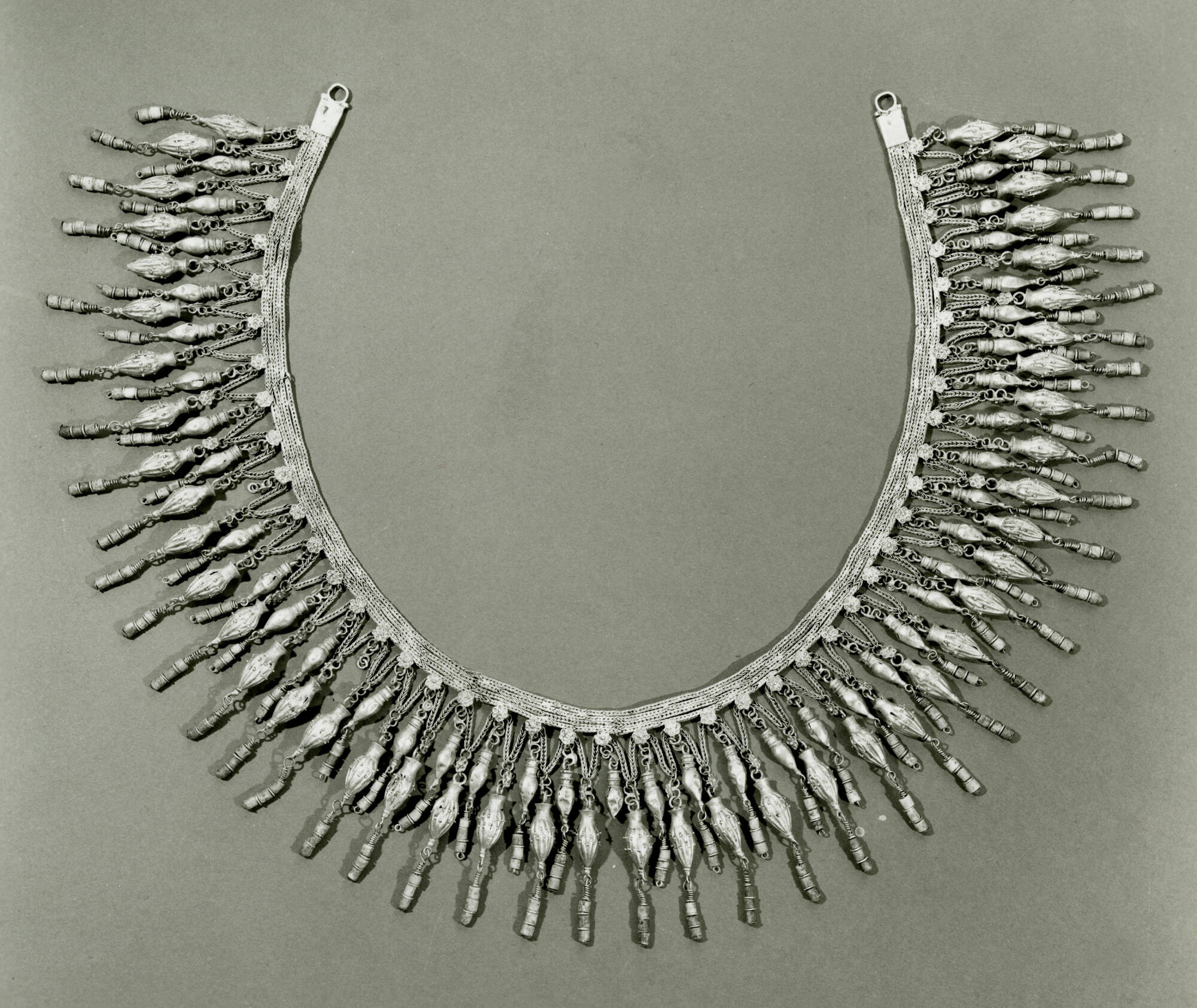 DescriptionThis wide strap necklace consists of four loop-in-loop chains linked together, ending in rectangular box terminals with brazed loops. It was likely worn pinned at the shoulders across the chest. Two rows of amphora-shaped pendants hang from the strap—larger fluted pendants suspended on short chains alternate with smaller, smooth-walled pendants. Each pendant carries three turquoise faience beads threaded on gold wire with gold discs. Rosette details mask the jump loops and suspension junctures, possibly once colored with enamel. Five pendant elements are missing.