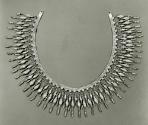 Label TextThis dazzling necklace was designed to be draped across the body from shoulder to shoulder, rather than worn around the neck. The tiny gold pendants are shaped like amphoras (storage jars), a popular motif in the Hellenistic world. An ancient inventory from the temple of Artemis on the island of Delos records a dedication of a "necklace of amphoras" identical to this type. What makes this example special is the use of turquoise faience (a glazed ceramic) for the beads at the bottom of the fringe. Faience was a specialty of Egyptian craftsmen, suggesting this Greek-style jewelry may have been produced in Alexandria, Egypt, where Greek and Egyptian cultures merged under the Ptolemaic kings.Published References"Recent accessions...;" Art Quarterly, vol. 35, no. 4, 1972, p. 435, repr. p. 444.