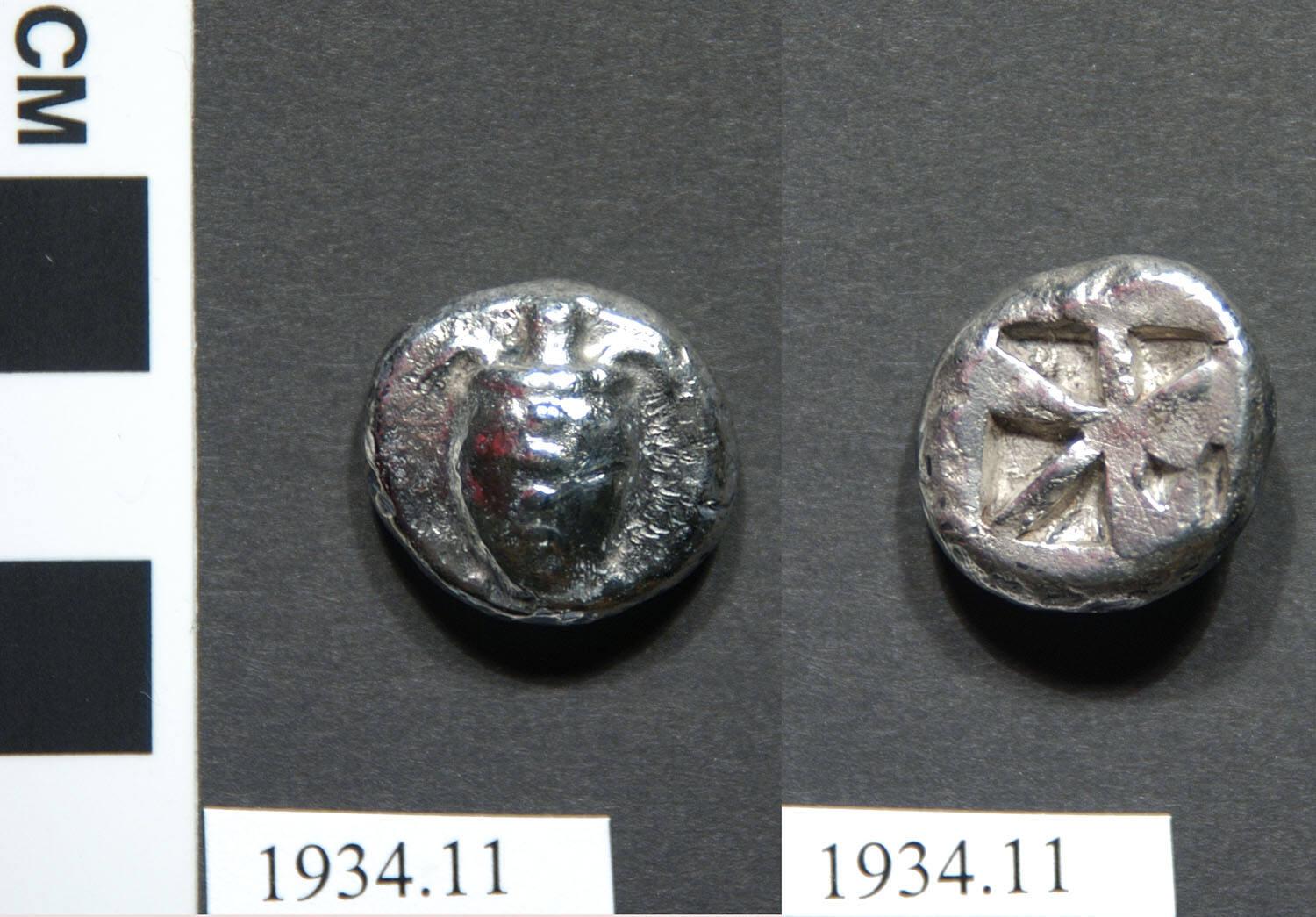 Label TextThis is an early example of the famous "turtle currency" of the trading island of Aegina, the first coinage minted in Greece.Comparative ReferencesSee also Kraay, Colin and Max Hirmer, Greek Coins, New York, 1966, no. 355, pl. 113, p. 321.about 450-423 BCE