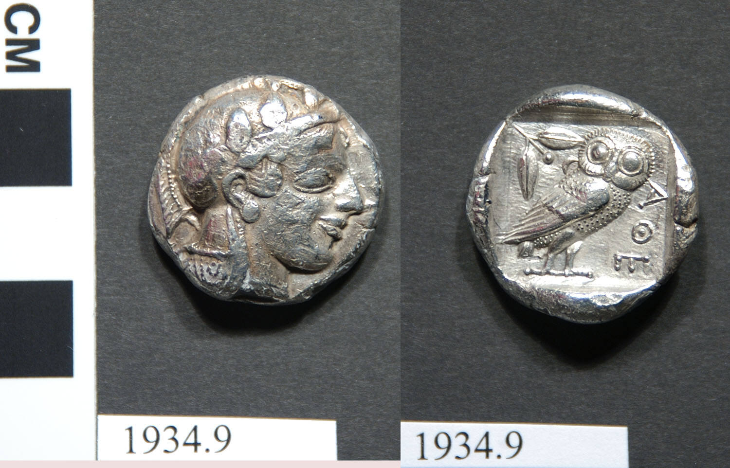 Label TextThis coin was one of the most trusted currencies of the Greek world. The head of Athena, patron goddess of the city, and her sacred bird, the owl, symbolized Athens’ power and wealth.Comparative ReferencesSee also Kraay, Colin and Max Hirmer, Greek Coins, London, 1966, no. 363, pl. 119.550-480 BCE