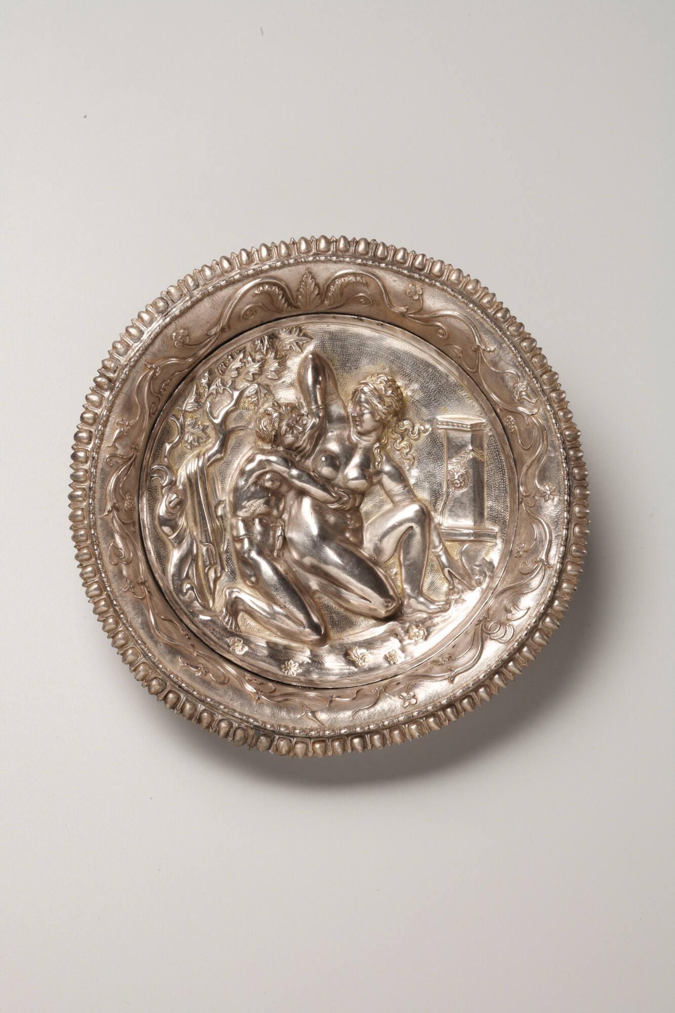 Label TextA lusty satyr seizes a nymph about the waist, while she desperately tries to push him away. They wrestle in a secluded grove, with leafy trees and a flower-strewn ground, where the nymph has hung her clothes on a tree in order to bathe at the fountain. The nymph’s pose is based on a popular mid-3rd century BCE cult statue of Aphrodite kneeling to bathe. In Greek mythology, nymphs were nature spirits in the form of beautiful young women, often associated with springs or other outdoor locations. Satyrs were the semi-bestial male companions of the god Dionysos, who roamed the forests and mountains. Such an elaborate dish was likely meant for display, rather than for serving food.Published ReferencesOliver, Andrew Jr., "New Hellenistic Silver: Mirror, Emblem Dish and Spoons," Jahrbuch der Berliner Museen, vol. 19, 1977, pp. 13-22.