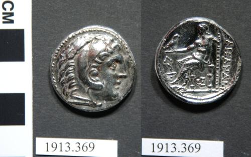 Label TextThe head of Herakles and the figure of Zeus on these two standard coins (9 and 10) of Alexander the Great show the extent to which the conqueror spread Greek culture throughout his empire. The image of the seated god is taken from the renowned statue of Zeus.about 333 BCE