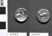 Label TextThe figure riding the dolphin is the city’s founder, Taras. In the background is Athena’s sacred owl.Comparative ReferencesSee also Evans, A.J., "The Horsemen of Tarentum," Numismatic Chronicle, IX, 1889, p. 1-229. The TMA example corresponds closely to Evan's pl. 9, 3, which dates from Tarentum's period of alliance with Rome in 272-235 B.C.229-197 BCE
