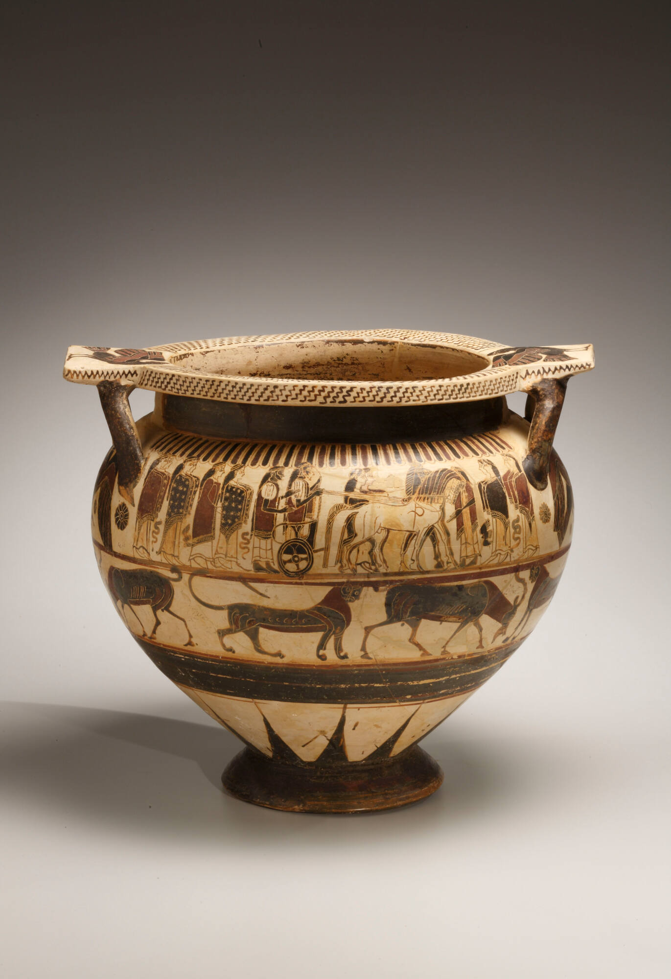 Label TextThis large Corinthian column krater presents two contrasting scenes: a deadly boar hunt and a serene wedding procession. On one side, fierce hunters and snarling dogs confront a massive boar, recalling tales of legendary hunts in Greek mythology. On the other, a stately chariot carries a veiled bride, surrounded by attendants. Created in the city of Corinth around 560 BCE, this vessel was used to mix wine and water at social gatherings called symposia.Published ReferencesLuckner, Kurt T., "Greek Vases: Shapes and Uses," Toledo Museum of Art Museum News, vol. 15, no. 3, 1972, p. 71, figs. 13-14.