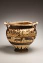 DescriptionLarge Corinthian mixing vessel with two figural friezes: a boar hunt and a wedding procession. Decorated with incised details, added red for emphasis, and bands of black and red glaze. Features griffins and sirens on handle plates and a lower frieze of roosters, deer, and goats.
