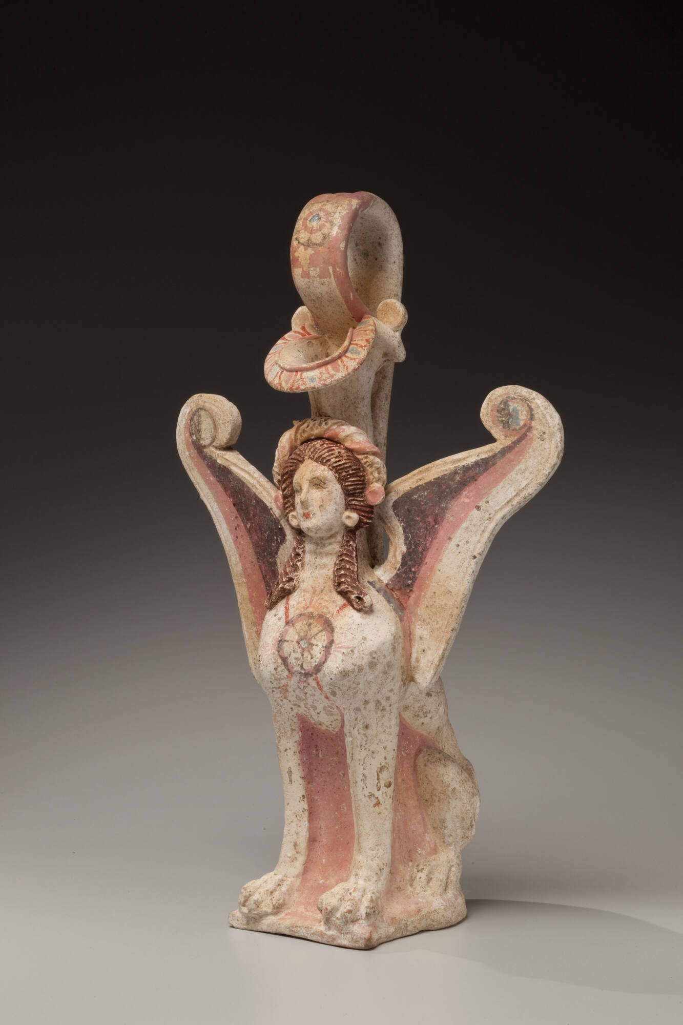DescriptionA seated sphinx faces forward, her wings spread wide and a handle arching from her back to a sharply angled trefoil spout. The rim is decorated with a painted egg-and-dot pattern, flanked by disc motifs on either side of the handle. Her brown hair falls over her shoulders, topped by a lemniscus wreath and fillet. She wears earrings and a wheel-shaped pendant with palmettes that hang from her shoulders, mirrored by a similar wheel motif painted on the handle. The main body was molded, with separately attached wings, spout, neck, and handle. Details like the hair and wreath were tooled after molding. The vessel has an open base and a sealed neck, identifying it as a non-functional piece likely intended for funerary use.