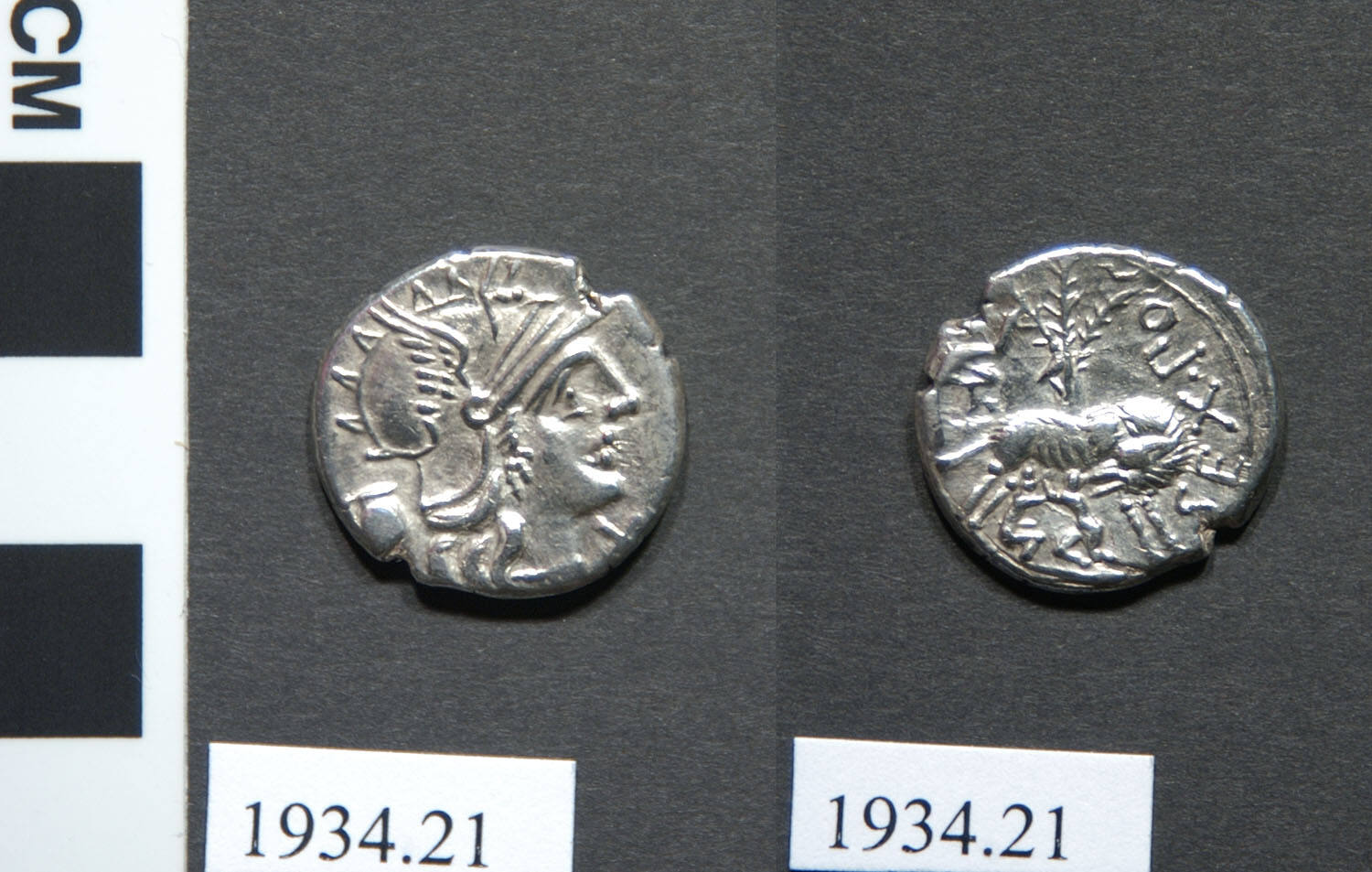 DescriptionObverse: Head of Roma in winged helmet; behind, one handled jug; under chin, X.