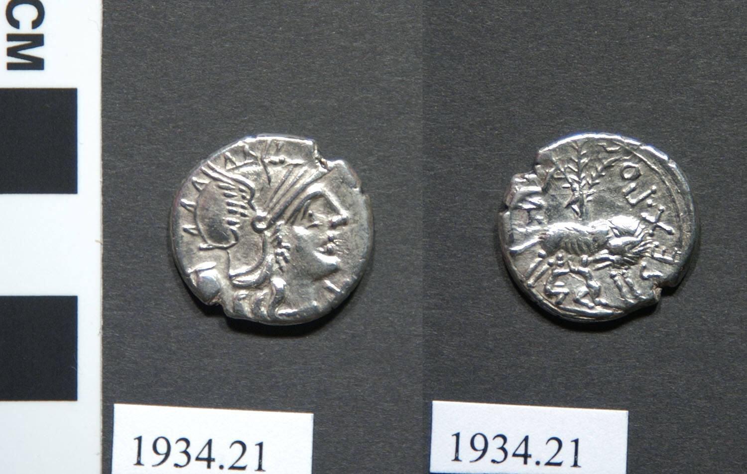 Reverse: Wolf standing facing right, head turned back, suckling the twins, Romulus and Remus; in the background, a fig tree in the branches where three birds are perched, behind the wolf stands the shepherd Faustulus leaning with left hand on staff and raising right hand; written around side: SEX PO (FOSTULUS).