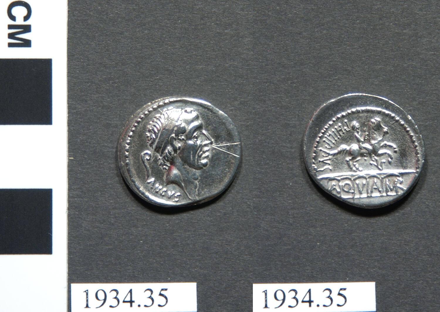 Label TextThis coin was mited by Phillipus to associate him with his illustriuous ancestors, all members of the Marcius family. Ancus Marcius, shown on the obverse of this coin, was the fourth king of Rome who lived in the 7th century B.C.Comparative ReferencesSee also Grueber, H.A., Roman Coins in the British Museum, London, 1910, vol. I, p. 485, no. 3890.about 101 BCE